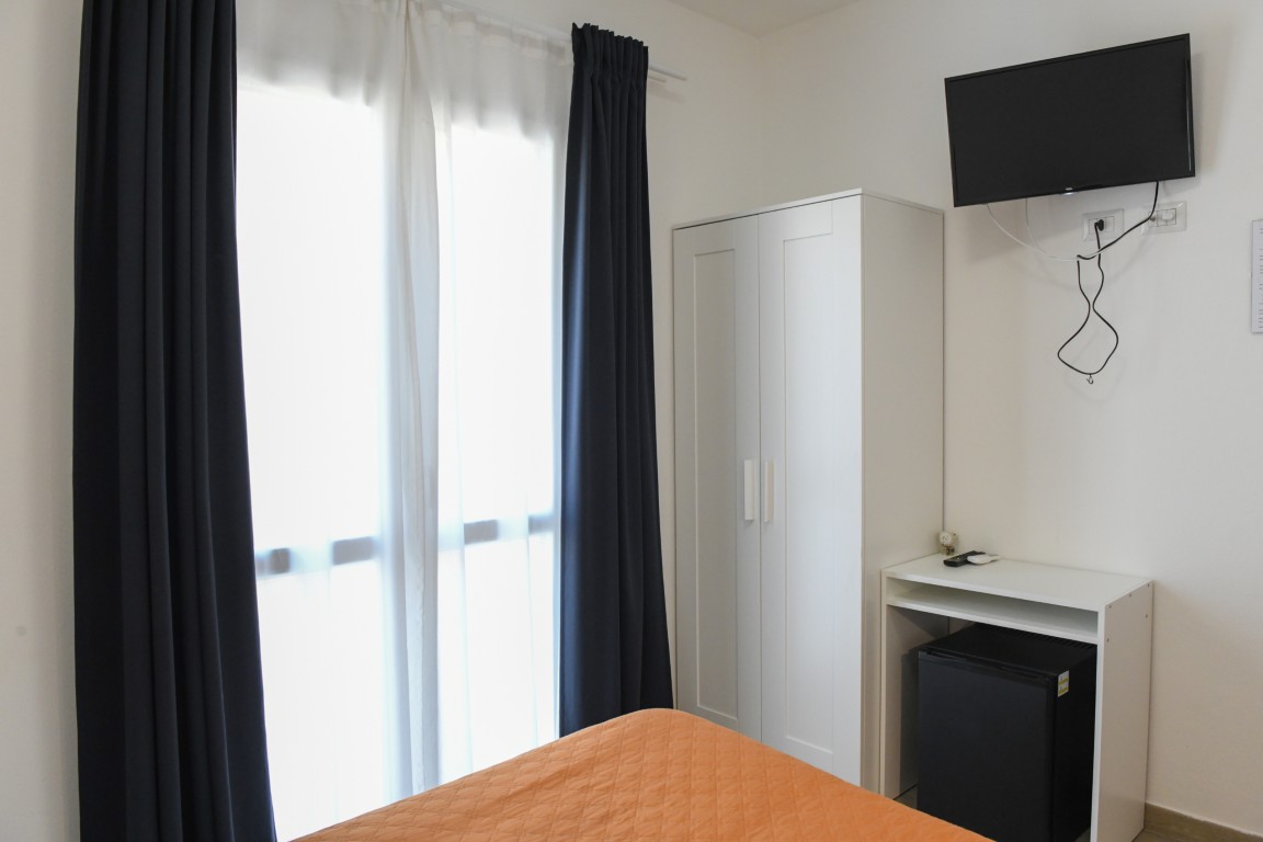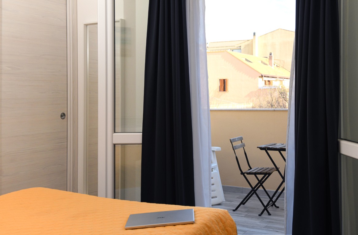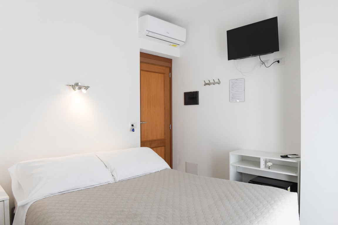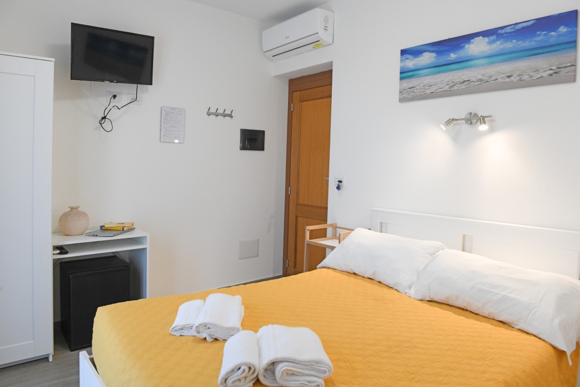 Camera ubicata all'ultimo piano e dotata di bagno privato con doccia, aria condizionata, riscaldamento, TV digitale terreste, TV satellitare, frigobar, cassaforte, ampia terrazza attrezzata.